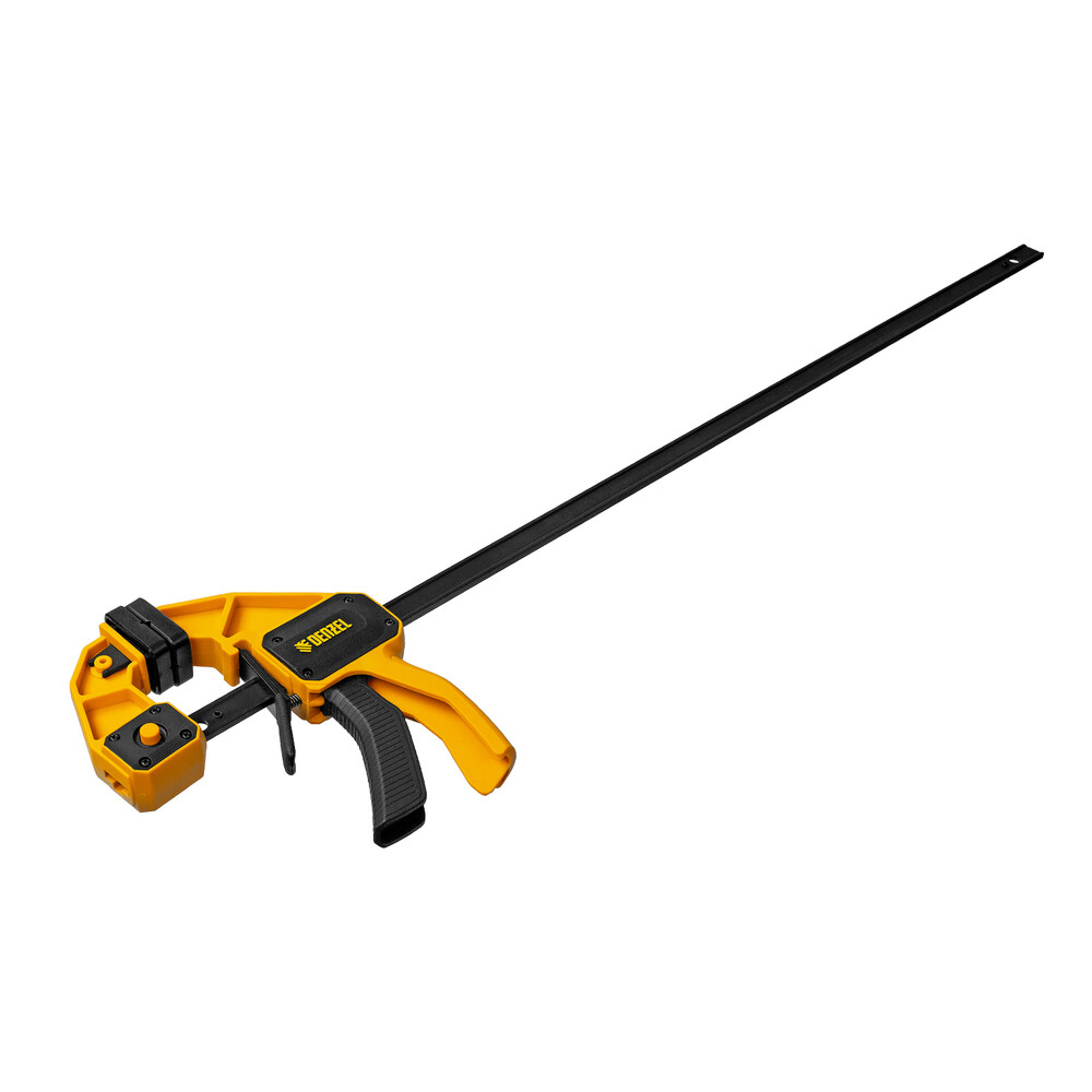 — Комфортное использование — струбцина весит всего 764 г, обрезиненная кнопка фиксации обеспечивает удобный захват.