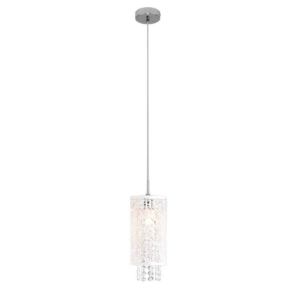Светильник с металлическим плафоном в белом цвете, украшенным декоративным хрусталем, оснащен системой регулировки высоты подвеса, позволяющей размещать изделие на разных уровнях, уменьшая или увеличивая угол рассеивания светового потока. Данный светильник легко устанавливается на потолке при помощи монтажной планки.
