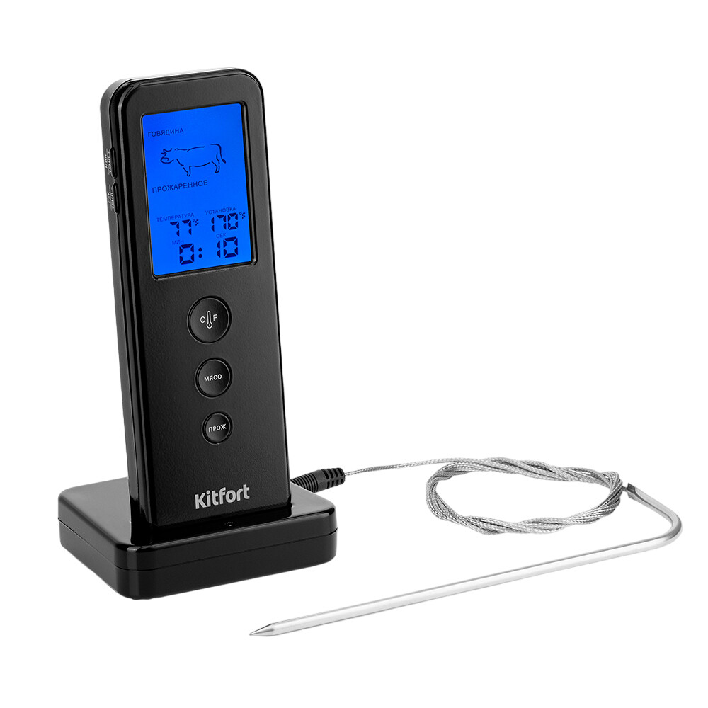 Термометр для мяса Kitfort KT-2067 предназначен для определения готовности и степени прожарки мяса. В термометре вы можете выбрать вид мяса: говядина, баранина, телятина, фарш, свинина, индейка, курица или рыба. Термощуп и термостойкий шнур позволяют измерять температуру внутри куска мяса в духовке, на сковороде или при любом другом способе приготовления. Шнур термощупа подключается к базе, поэтому во время готовки вы можете свободно перемещать блок управления в пределах 30 метров, устанавливать вблизи места приготовления мяса необходимо только базу. Помимо предустановленной температуры можно настроить любую другую температуру. Таким образом, термометр можно использовать не только с предустановленными настройками или не только для разных видов мяса, но и для выпечки или других блюд.Термометр можно использовать в качестве таймера и секундомера. Блок управления и база питаются от четырёх батареек типа ААA. На обратной стороне блока управления есть подставка и монтажное отверстие, чтобы поставить его на стол или повесить на стену.