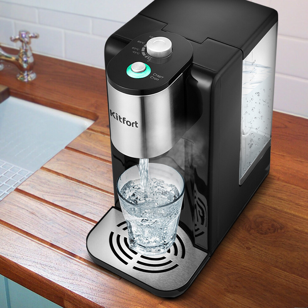 Термопот Kitfort КТ-2502 служит для моментальной подачи воды заданной температуры без предварительного подогрева и ожидания. Подогрев осуществляется проточно, подача воды начинается в течение примерно 5 секунд после нажатия кнопки.