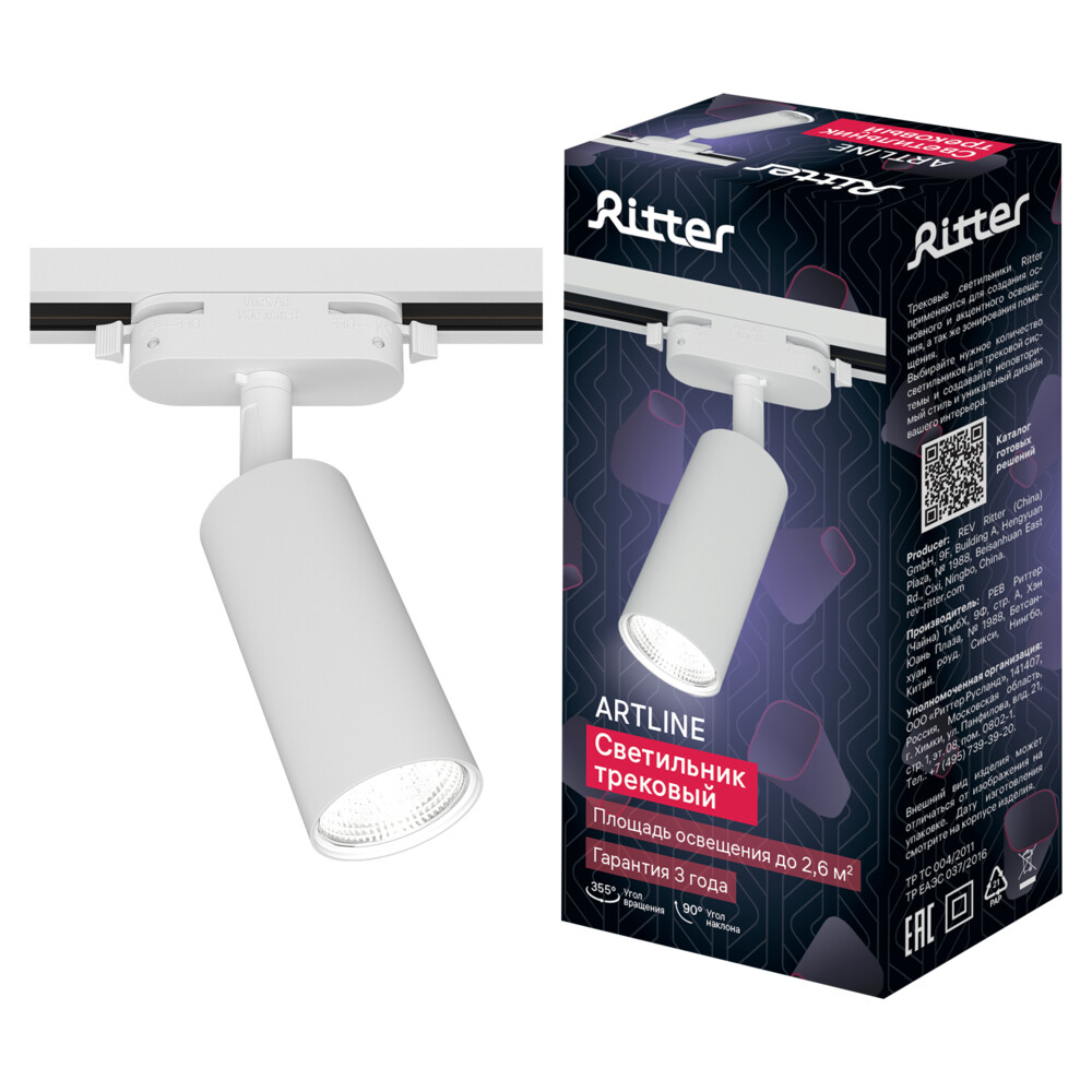 Трековый светильник Ritter Artline предназначен для основного, акцентного и дополнительного освещения жилых комнат, офисов, торговых помещений, кафе, ресторанов. Один светильник рассчитан на площадь освещения до 2,6 кв.м. Трековый светильник устанавливается на однофазный шинопровод с напряжением 220 В. Две точки крепления делают светильник универсальным и безопасным. После установки светильник легко перемещается по шинопроводу. В поворотном светильнике удобная регулировка направления светового луча. Угол поворота данного светильника составляет 355 градусов, а угол наклона — 90 градусов. Для работы светильника необходимо установить светодиодную лампочку с цоколем GU10 максимальной мощностью до 12 Вт.