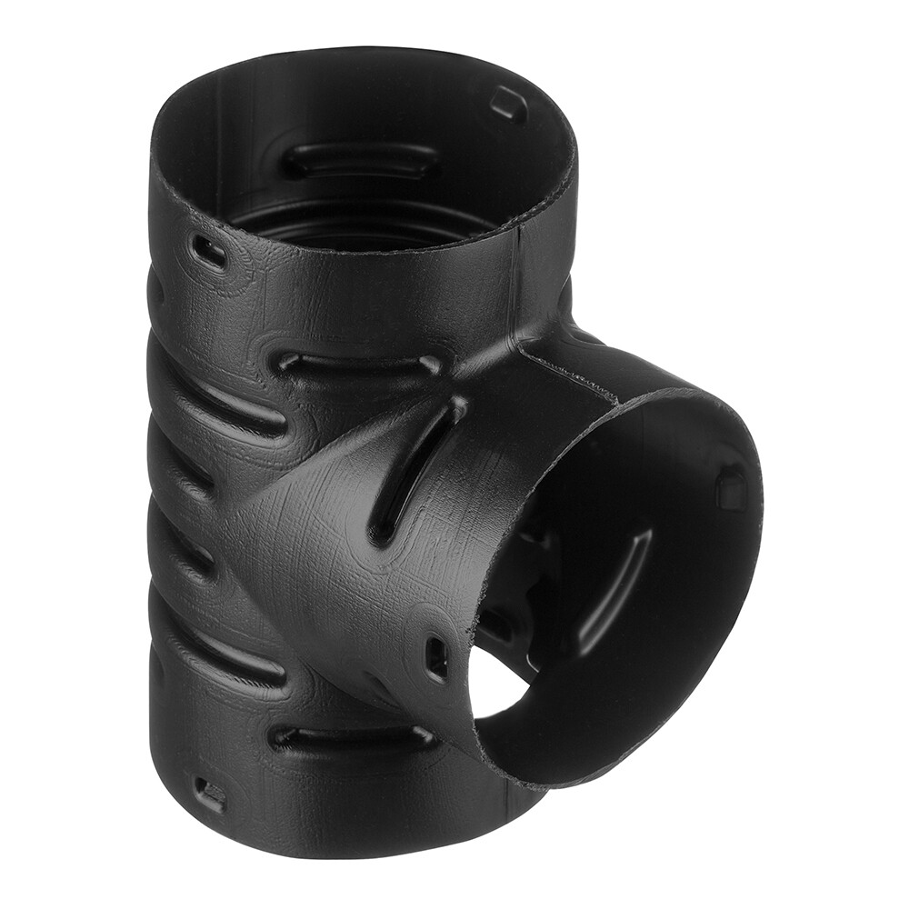Тройник представляет собой пластиковый элемент в виде буквы «Т» со специальными фиксирующими выступами с внутренней стороны, обеспечивающими надежное соединение, либо может поставляться в гофрированном виде.