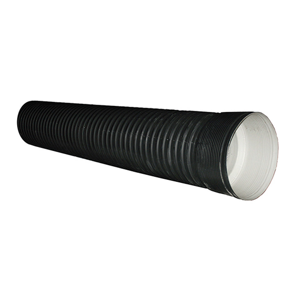 Труба имеет двуслойную структурированную стенку. Наружный слой — гофрированный, черного цвета, внутренний слой — гладкий, белого цвета.