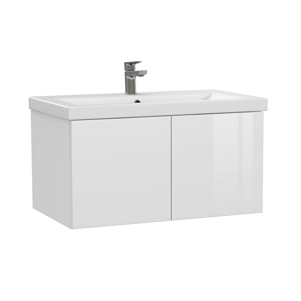 Белые глянцевые фасады, четкие геометрические формы тумбы помогут создать минималистичный и строгий интерьер ванной комнаты.