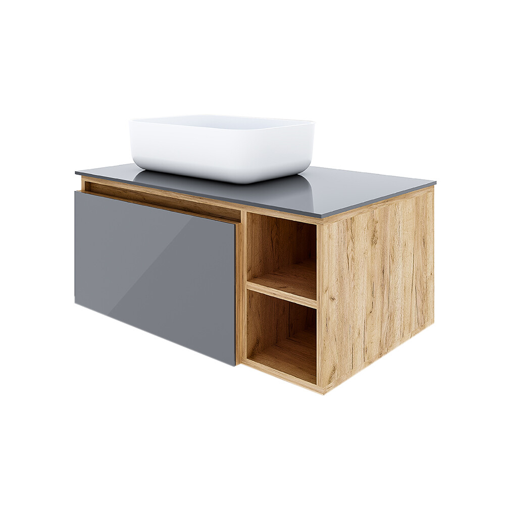 — Фасад и столешница тумбы выполнены из безопасного закалённого стекла молочного цвета, корпус — влагостойкий ЛДСП цвета дуб крафт золотой.