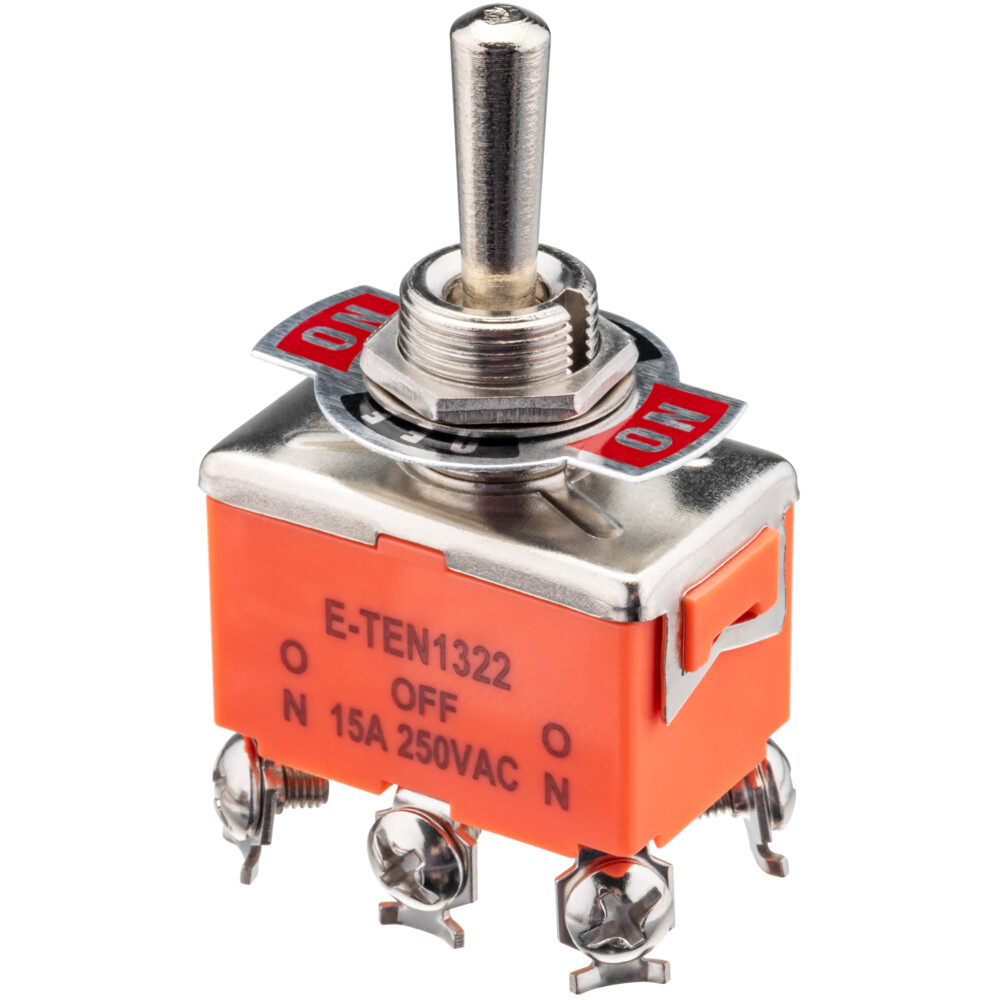 Металлический перекидной переключатель имеет 3 типа переключения On-Off-On. Подключение контактов осуществляется с помощью винтов.