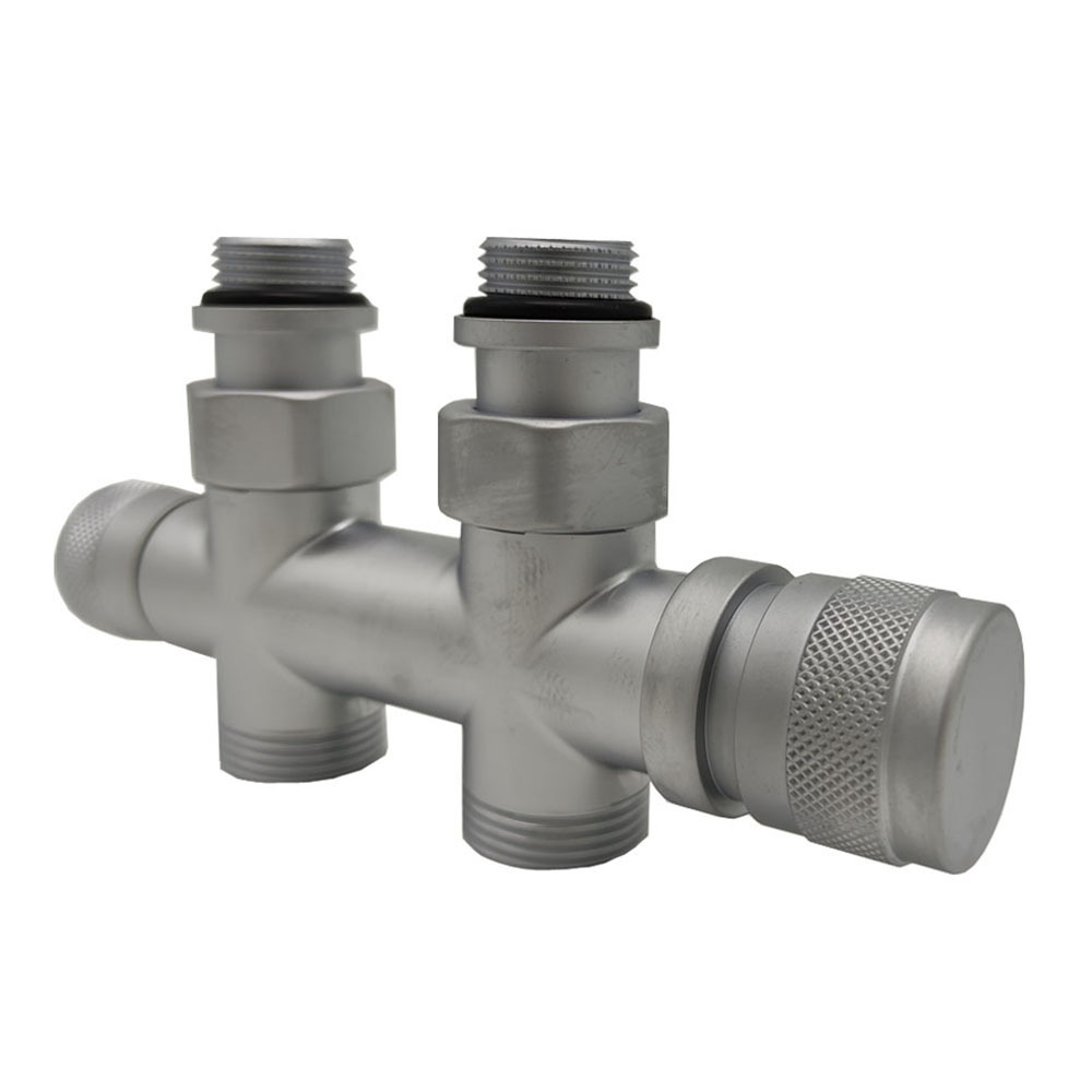 Узел SR Rubinetterie прямой для нижнего подключения радиаторов — вентиль на подачу ручной регулировки, преобразуемый в термостатический, с механизмом предварительной настройки и запорный клапан. Межосевое расстояние 50 мм, соединение для медных или многослойных труб, резьбовые переходники для подключения к радиатору с герметичной прокладкой.