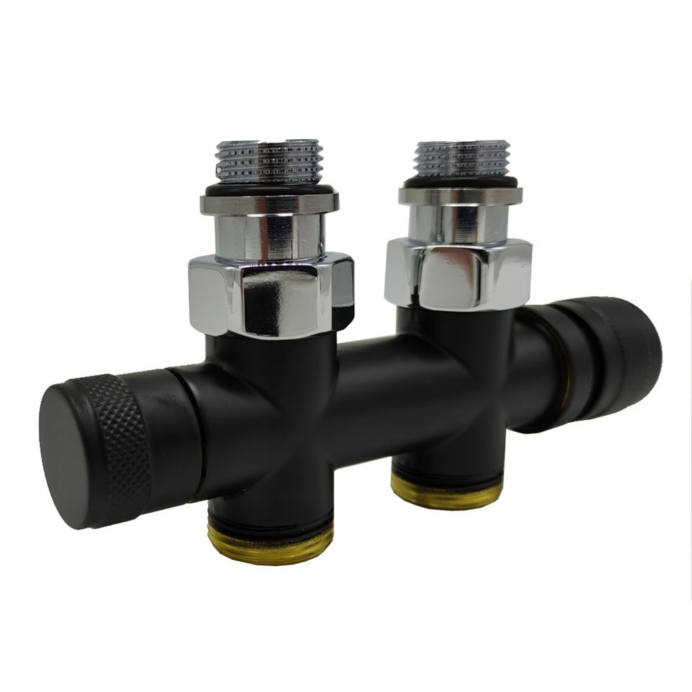 Узел SR Rubinetterie прямой для нижнего подключения радиаторов — вентиль на подачу ручной регулировки, преобразуемый в термостатический, с механизмом предварительной настройки и запорный клапан. Межосевое расстояние 50 мм, соединение для медных или многослойных труб, резьбовые переходники для подключения к радиатору с герметичной прокладкой.