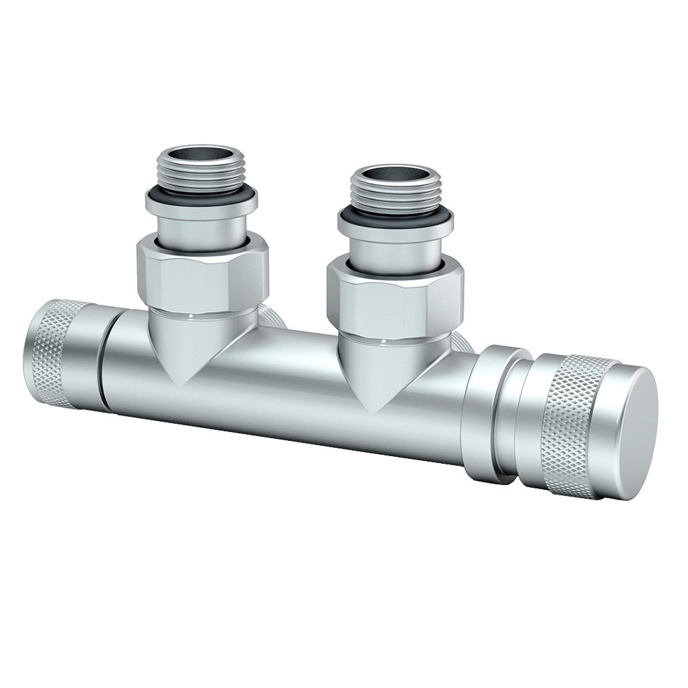 Узел SR Rubinetterie угловой для нижнего подключения радиаторов — вентиль на подачу ручной регулировки, преобразуемый в термостатический, с механизмом предварительной настройки и запорный клапан. Межосевое расстояние 50 мм, соединение для медных или многослойных труб, резьбовые переходники для подключения к радиатору с герметичной прокладкой.