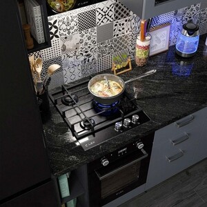 Газовая варочная панель шириной 400 мм изготовлена из закаленного стекла лаконичного черного цвета и снабжена чугунными решетками. В модели используется механическое управление. Панель оснащена 3 конфорками, одна из которых Wok с тройным рядом пламени для приготовления блюд азиатской кухни. Варочная панель также имеет конфорку быстрого нагрева, электроподжиг и газ-контроль, прекращающий подачу газа, когда пламя случайно гаснет. Подходит для магистрального и баллонного газа.