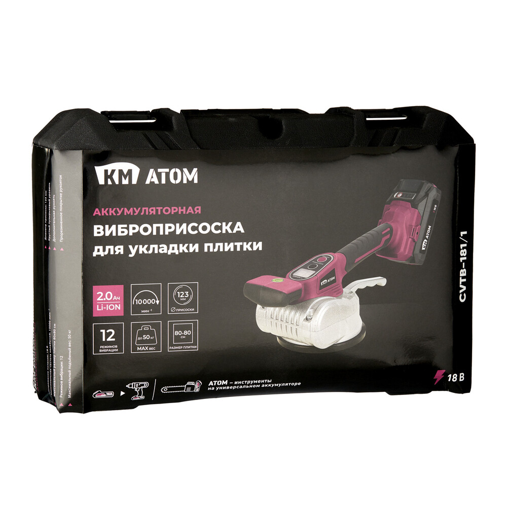 Виброприсоска для укладки плитки аккумуляторная КМ АТОМ 18В Li-Ion 2Ач АКБ и ЗУ (CVTB-181/1)