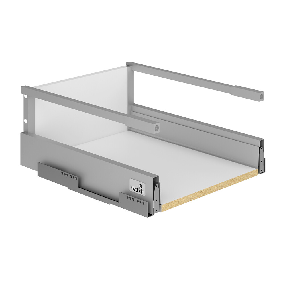 Универсальная система InnoTech — дизайн и функциональность системы, основанной на единой платформе, невероятно точно подстраивается под ваши требования. В основе ящиков стальные боковины с лакированным порошковым покрытием серебристого цвета. Дно и задняя стенка ящика выполнены из ЛДСП белого цвета. Комплект выдвижного ящика Hettich Innotech на направляющих частичного выдвижения. Ящик подходит к кухонному шкафу напольному Иннотех 45х72х56 см, код 1081092.