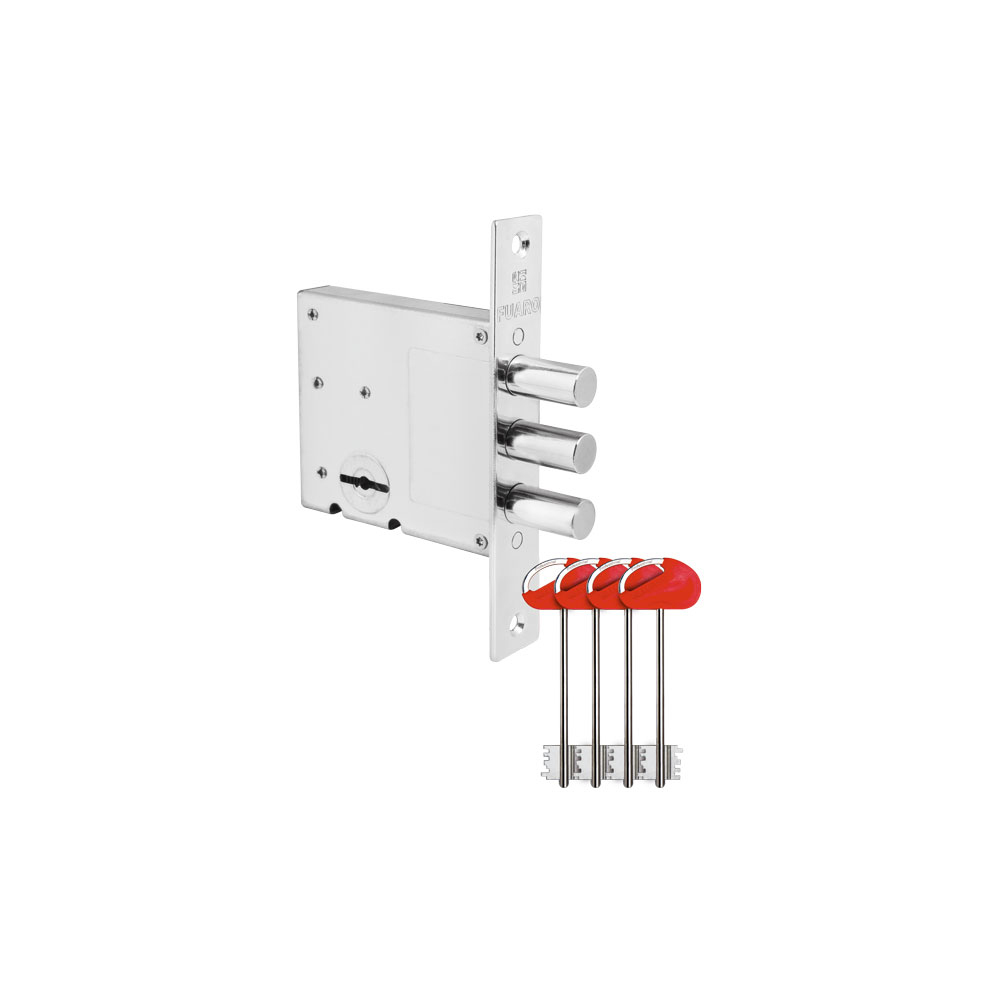 Замок врезной сувальдный Fuaro V10/S-60.00.3R14 с тремя ригелями предназначен для установки во входные и технические металлические двери. Стальной оцинкованный корпус. Универсальная установка, подходит для левых и правых дверей. Бэксет — 60 мм. Выход ригелей — 26 мм. Открывание -2 полуоборота. Диаметр ригелей -14 мм.