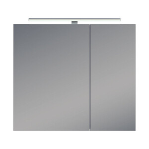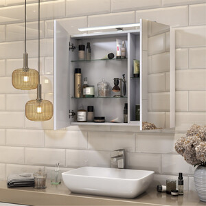 зеркальный шкаф в сборе, навес врезной 35х12 с регулировкой – 2 шт., дюбель 8х50 – 2 шт., саморез 5,5х60 – 2 шт., светодиодный светильник.